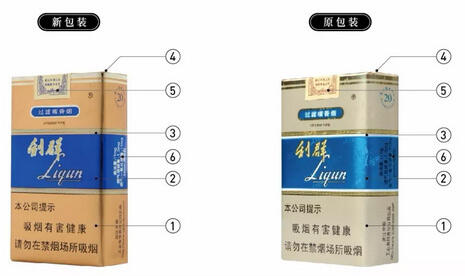 (1)包装主色调由土黄色变为金黄色,中间蓝色模块由淡蓝色变为深蓝色;(2)去掉中间蓝色模块上下两端的白色带,蓝色模块区域略有扩大;(3)铝箔纸金色加深,并印刷“利群Liqun”字样;