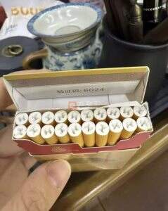 中华(细支6mg)采用纸盒包装,整条颜色采用彩金色,一改中华的大红底色,也是首次采用低焦油6mg。中华品牌采用这种颜色也非首次,之前文章介绍过,上世纪五六十年代及上世纪八十年代均采用过此种颜色进行外观调整,“中华”二字采用金边大红显得特别醒目、提气。