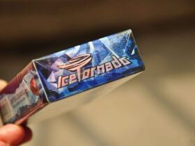 此款香烟非常适合夏天品尝的超级冰爽的好烟,整个包装就给人有种冰爽的感觉,画面的冰龙卷风图案给人以震撼的感觉,烟盒上部的朗博基尼跑车的红盾奔牛标志非常醒目,豪华尊贵,中间的ICE TORNADO的冰龙卷风英文大字苍劲有力,T的字母上还用了旋风的图样,还没抽到此烟,已感觉到阵阵凉意。顶部和底部都是ICE TORNADO的冰色字样和LASER 的蓝底相配合非常的显眼,漂亮!