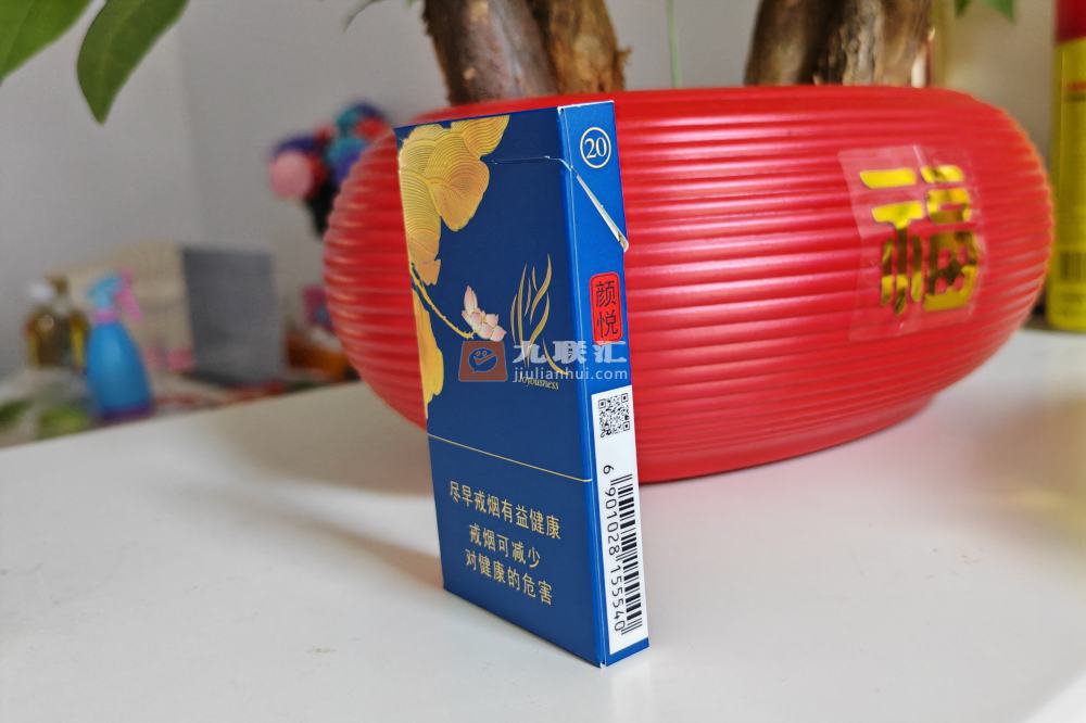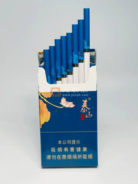 泰山蓝颜悦细支烟盒设计融合美学与实用,以深邃蓝色为主色调,烫金泰山标识,金色浮雕花瓣,盒面印有粉色荷花与金色叶片图案,具有高端神秘之感,寓意纯洁美好,"泰山"二字以艺术字体呈现,"颜悦"二字融入红色印章样式设计,具有国潮韵味,翻盖处设有二维码。 泰山蓝颜悦细支烟盒设计融合美学与实用,采用条盒硬盒细支形式,以深邃蓝色为主色调,烫金泰山标识,金色浮雕花瓣,具有高端神秘之感。 盒面印有粉色荷花与金色叶片图案,寓意纯洁美好,“泰山"二字以艺术字体呈现,“颜悦"二字融入红色印章样式设计,具有国潮韵味,翻盖处设有二维码。